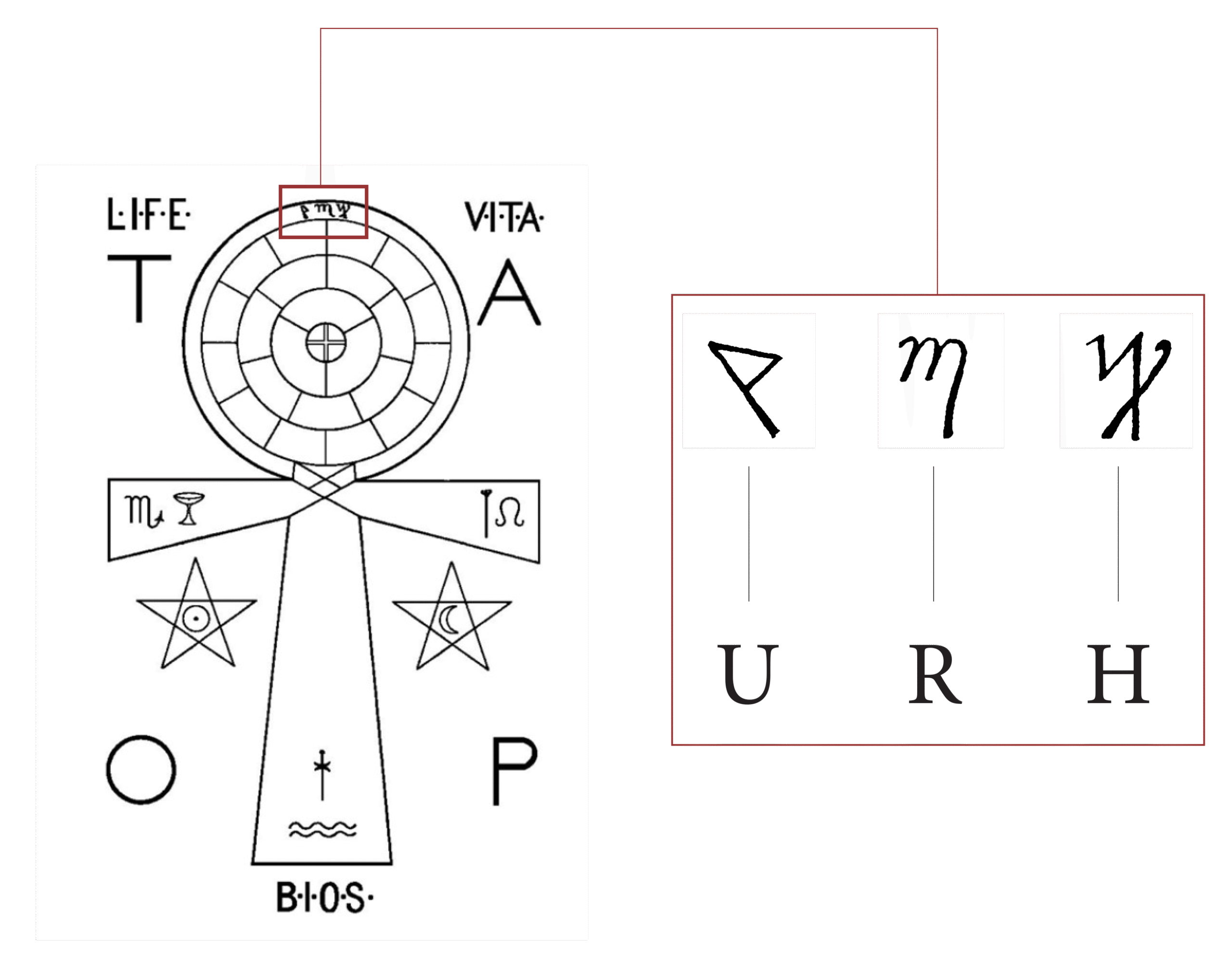 在同期公布的黄金黎明塔罗安卡符(Ank of the Tarot)里,HRU的名号被用底比斯符文(Theban Scripts) 从右到左写在了最外环的圈上。英文中的 L.I.F.E 与 拉丁语里的 V.I.T.A 在左右两侧互相呼应,也同样对应着底部希腊文的B·I·O·S,三者均意为“生命”。镇守十字两侧的五芒星里分别嵌入了代表金的太阳以及代表银的月亮,这是能量的平衡,也是生命之源的象征。