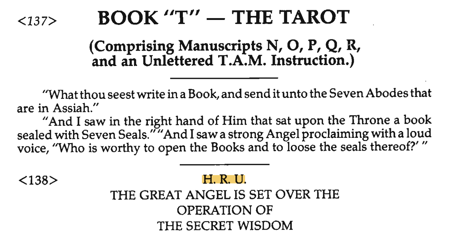 H.R.U.,掌管秘奥智慧运作的大天使,其名号最早出现于 5°=6° 小行家阶位(Adeptus Minor)的塔罗指导书 ——《Book T》的扉页。祂被认为是塔罗的守护天使,通常被卜算者在占卜仪式中召唤出来,以寻求指引。