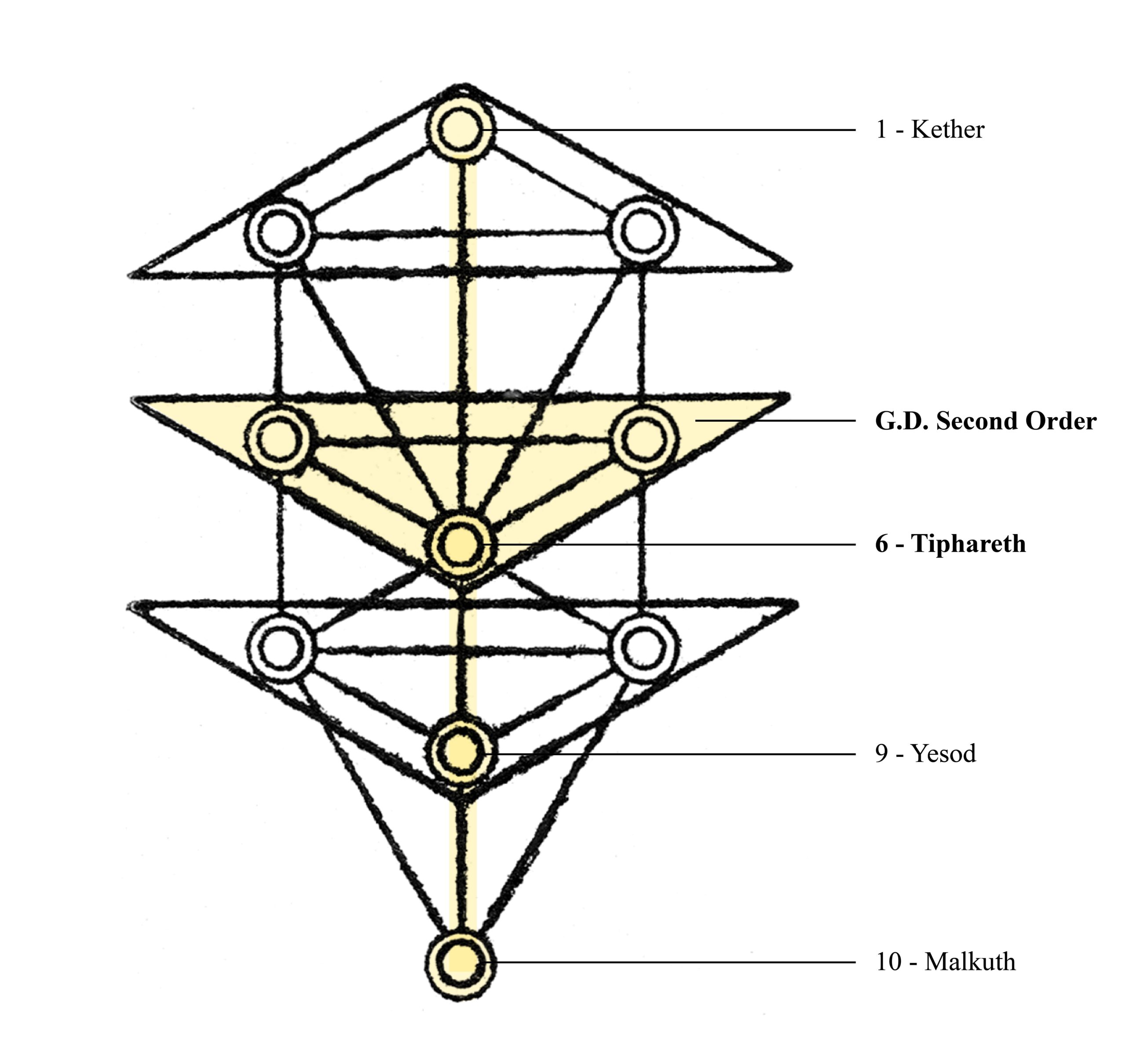 接着,再提取上述生命之树图表里的三角形并化简,我们得到三组递进的大三角(Triad),以及最底部象征物质世界的Malkuth。众所周知,生命之树的原质能量皆以大三角的形式运作,黄金黎明结社的内部结构——即三大阶(Three Orders)——也正是基于这三组大三角设计。